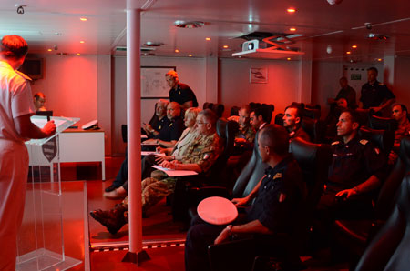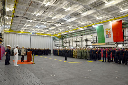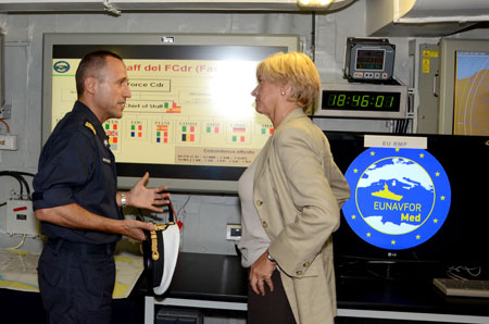 “I would like to express my greetings to the entire international staff engaged in the EUNAVFOR MED mission” said the Minister, Roberta Pinotti, while visiting the mission Force Command headquarters, based onboard the Italian aircraft carrier Cavour, deployed in the Southern Mediterranean Sea.