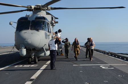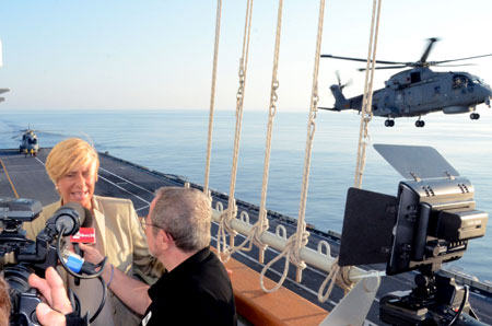 Minister Pinotti landed onboard the European fleet flagship, as she patrolled off the coast of Lampedusa, in the afternoon, together with the Chief of the Italian Defense, General Claudio Graziano, the Chief of Italian Navy, Vice Admiral Giuseppe De Giorgi and the Commander in Chief of the Italian Fleet, Vice Admiral Filippo Maria Foffi.